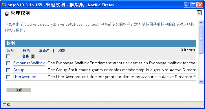 而说明对于此权利的作用进行了足够详尽的说明,描述了此权利可以授予或取消 Microsoft Exchange 用户的 Exchange 邮箱。 出现在管理代理(例如,基于职能权利的 iManager)中的显示名称为 Exchange Mailbox Entitlement。 该名称是权利的相对判别名 (RDN)。 如果没有定义显示名称,则权利的名称就是它的 RDN。
