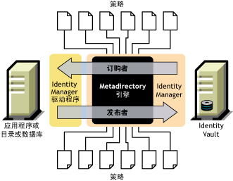 Metadirectory 引擎是 Identity Manager 体系结构中的关键模块。它提供的接口允许 Identity Manager 驱动程序与 Identity Vault 同步信息,即使完全不同的数据系统也可以连接并共享数据。