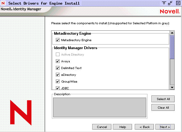 《Select Drivers for Engine Install(选择用于安装引擎的驱动程序)》页显示可以在相应平台上安装哪些驱动程序。 例如,在 NetWare 服务器上,无法安装 Windows Active Directory 驱动程序。