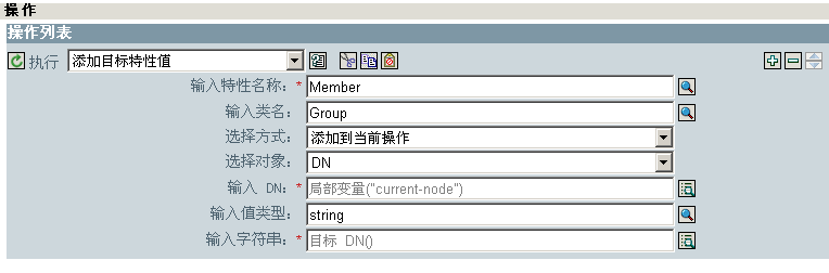 要定义“添加目标特性值”操作,请单击起动自变量操作构建器的图标。在自变量操作构建器中,可以定义所需的操作。在下面的示例中,将 member(成员)特性添加到每个已添加的“组”权利的目标对象中。