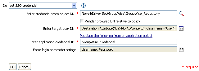 创建用户对象或修改口令后,设置 SSO 身份凭证。此操作是身份凭证供应策略的一部分。有关详细信息,请参见Section 4.0, Novell 身份凭证供应策略。