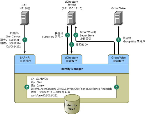 Figure 4-5显示的方案典型而简单,它向 GroupWise® 的新用户供应了一次签到身份凭证。该部门通过 SAP HR 系统和 Identity Manager 向 Identity Vault 供应新用户。根据组织信息,这些用户随后将供应给 eDirectory 上实现的部门鉴定树。新用户通过该树鉴定到网络,同时该树也是 GroupWise 安全身份凭证的储存库,Novell iChain® 或 Access Manager® 使用该储存库从公司防火墙外部提供安全的一次签到功能。由于随后 Identity Manager 会将用户供应给 GroupWise,因此这些系统的身份凭证将与鉴定树中这些身份凭证的 SecretStore 特性同步。