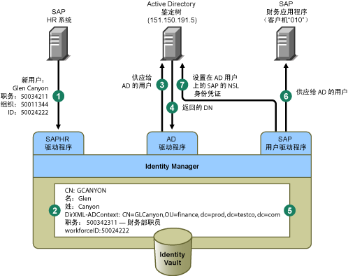 该部门通过 SAP HR 系统和 Identity Manager 向 Identity Vault 供应新用户。根据组织信息,将用户对象供应给在 Active Directory 上实现的部门鉴定树。在该树中,新用户鉴定到网络,因此 SecureLogin 身份凭证储存库也在该树中。因为 Identity Manager 随后将向用户供应各种财务应用程序,所以这些系统的用户身份凭证与 Active Directory 中的 SecureLogin 储存同步。