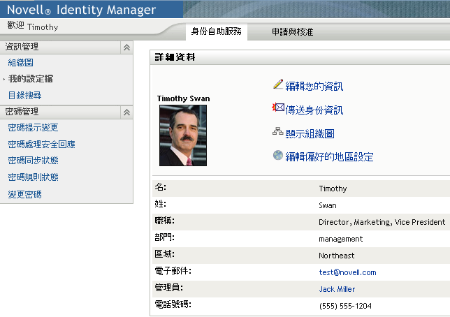 以下场景显示某个用户如何链接到另一用户和组细节。 Timothy Swan(市场营销部副总管理者)登录 Identity Manager User Application,然后进入“我的配置文件”页面: