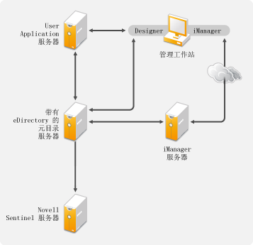 借助在 Designer 中收集的信息,您可做出有关 Identity Manager 的各个组件的技术决策,如安装位置和配置选项。有关各个组件的介绍,请参见《Identity Manager 3.6.1 概述指南》。图 3-1 是 Identity Manager 解决方案的一个可能配置。