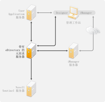 Identity Manager 解决方案中可具有一个或多个元目录服务器,具体取决于服务器工作负载。元目录服务器要求安装 eDirectory,如图 3-3 中所示。您可添加 Remote Loader 服务器(该图中不存在)以帮助处理环境中的工作负载或配置。