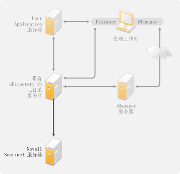 如果需要将审计和报告作为 Identity Manager 解决方案的一部分,则需要实施 Identity Audit 或 Novell Sentinel™。建议您在其各自所位于的服务器上运行 Identity Audit 或 Sentinel,如图 3-8 中所示。您的解决方案所需的服务器数量取决于环境中驱动程序的数量以及定义进行审计的事件数量。