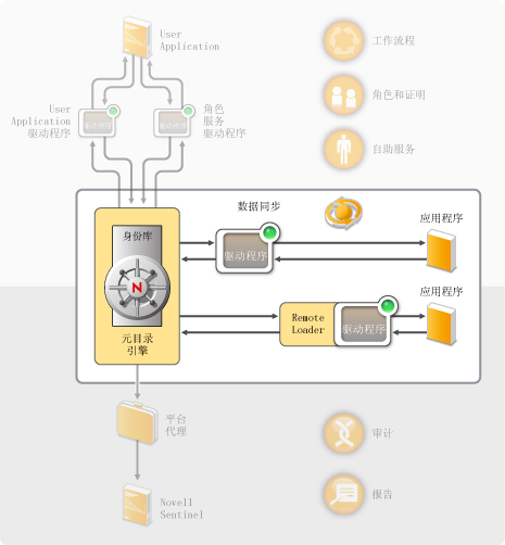 身份库: 身份库充当您要在应用程序之间同步的数据的元目录。例如,从 PeopleSoft 系统同步到 Lotus Notes 的数据将首先添加到身份库,然后再发送给 Lotus Notes 系统。此外,身份库还储存特定于 Identity Manager 的信息,如驱动程序配置、参数和策略。Novell eDirectory™ 用于身份库。