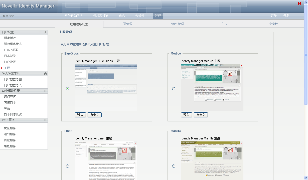 User Application 提供了基于万维网的管理控制台,使您可以配置、管理和自定义口令自助服务、角色和供应。对于指派有管理权限的任何人,将管理控制台作为选项卡添加在 User Application 中。