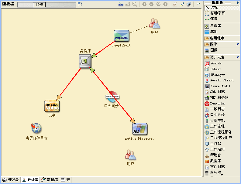 通过此步骤可创建有关业务的当前内容以及需要改进的流程的高级别概述。例如,图 2-1 使用 Designer 显示了新用户帐户是如何从 PeopleSoft 系统中生成的。这些用户帐户先同步到身份库,然后又同步到 Lotus Notes 和 Active Directory。口令在 Active Directory 和身份库之间同步。帐户会同步到 Notes 系统,但没有任何帐户会向后同步到身份库。