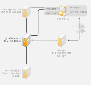 Identity Manager 解决方案中可具有一个或多个元目录服务器,具体取决于服务器工作负载。元目录服务器要求安装 eDirectory,如图 3-3 中所示。您可添加 Remote Loader 服务器(该图中不存在)以帮助处理环境中的工作负载或配置。