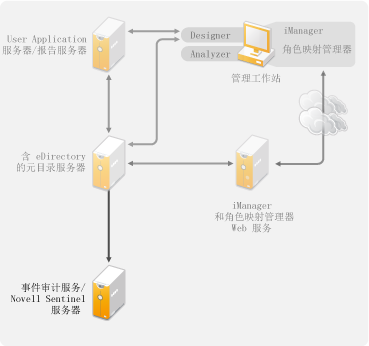 如果需要将审计和报告作为 Identity Manager 解决方案的一部分,则需要实施 Identity Audit 或 Novell Sentinel。事件审计服务或 Sentinel 应在其自身的服务器上运行,如图 3-8 所示。您的解决方案所需的服务器数量取决于环境中驱动程序的数量以及定义进行审计的事件数量。