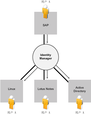管理现有用户的数据仅仅是 Identity Manager 的数据同步功能的开始。此外,Identity Manager 还可在目录(如 Active Directory)、系统(如 PeopleSoft 和 Lotus Notes)和操作系统(如 UNIX 和 Linux)中创建新用户帐户及去除现有帐户。例如,向 SAP HR 系统中添加新员工时,Identity Manager 可自动在 Active Directory 中创建新用户帐户,在 Lotus Notes 中创建新帐户以及在 Linux NIS 帐户管理系统中创建新帐户。