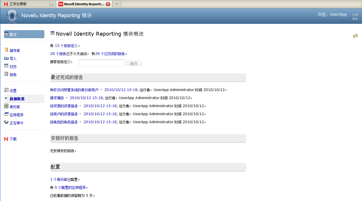 Identity Reporting 模块生成显示有关 Identity Manager 配置各方面的重要业务信息,包括从身份库和受管系统(如 Active Directory 或 SAP)中收集的信息。报告模块提供了一组预定义的报告定义,可用于生成报告。此外,它还允许导入在第三方工具中定义的自定义报告。报告模块的用户界面使安排报告在非高峰时段运行以优化性能变得非常简单。