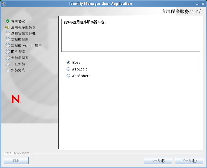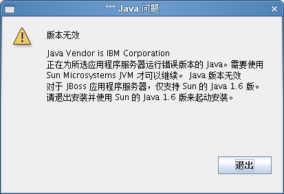注:对于 JBoss 5.1.0,安装程序需要使用 Sun 提供的 Java 2 Platform Standard Edition Development Kit 版本 1.6(JRE 或 JDK)。如果使用其他版本,则安装过程将无法成功配置 User Application WAR 文件。安装看似成功,但尝试启动 User Application 时遇到错误。