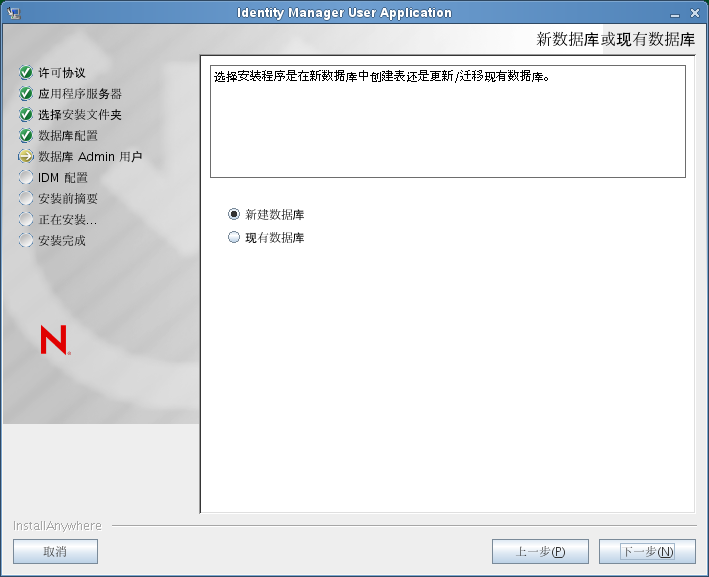 如果要使用的数据库是新的或空的,请选择按钮。如果数据库是先前安装中的现有数据库,请选择按钮。