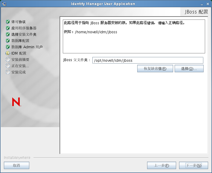 告知 User Application JBoss 应用程序服务器所在的位置。 此安装过程不安装 JBoss 应用程序服务器。有关安装 JBoss 应用程序服务器的指导,请参阅安装 JBoss Application Server 和 PostgreSQL 数据库。 :指定 JBoss Application Server 的位置。