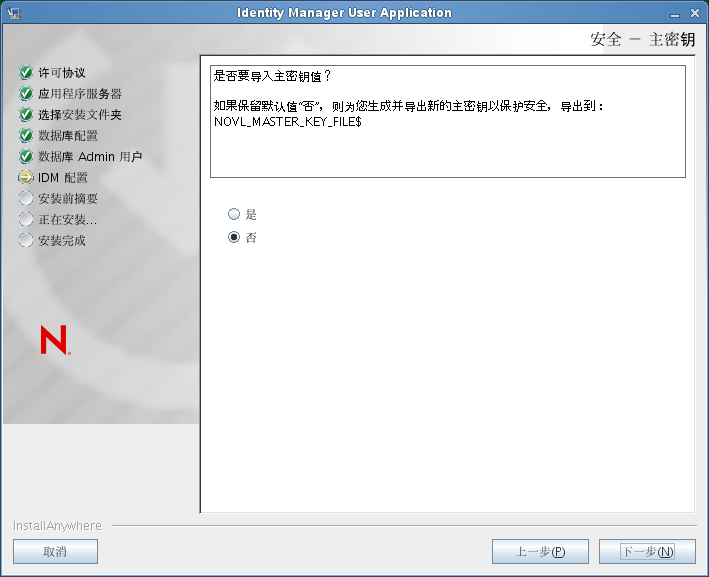 :允许您导入现有的主密钥。如果选择导入现有经加密的主密钥,请将密钥剪切并粘贴到安装过程窗口。 :创建新的主密钥。完成安装后,必须手动记录主密钥,如部分 9.1, 记录主密钥中所述。