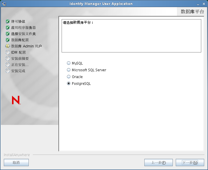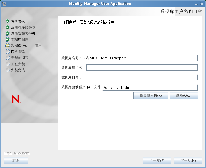 (或 SID):对于 PostgreSQL、MySQL 或 MS SQL Server,请提供数据库的名称。对于 Oracle,请提供以前创建的 Oracle 系统标识符 (SID)。对于群集,对其中每个成员指定相同的数据库名称或 SID。默认数据库名称是 idmuserappdb。 名:指定数据库的用户。对于群集,对其中每个成员指定相同的数据库用户。 :指定数据库的口令。对于群集,对其中每个成员指定相同的数据库口令。 :为数据库服务器提供瘦客户端 JAR。此项是必需的。
