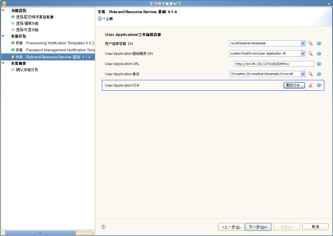 为基本容器和刚创建的 User Application 驱动程序指定 DN。因为尚未部署驱动程序,浏览功能将不显示刚配置的 User Application 驱动程序,所以可能需要键入驱动程序的 DN。