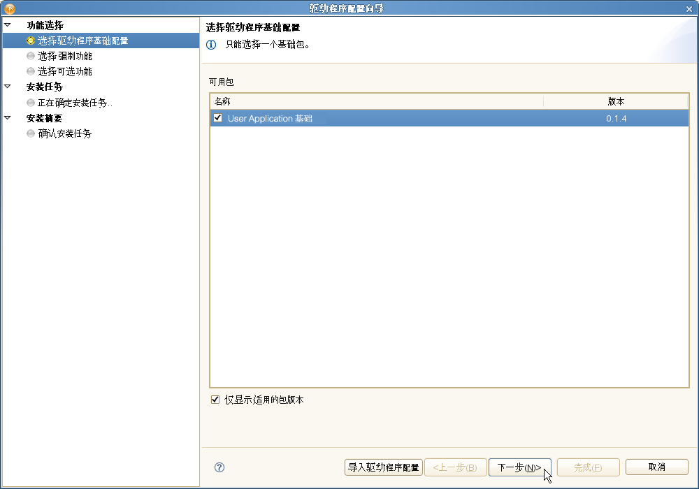 在尝试配置驱动程序前,需要确保包编目中具有所有必需的包。当您创建新 Identity Manager 项目时,用户界面会自动提示您将若干包导入该新项目。如果您选择不在创建项目时导入这些包,则需要在以后进行安装,如下所述。