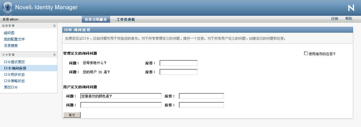 指定您自己的问题和这些问题的有效应答(如果您的口令策略启用了此功能)