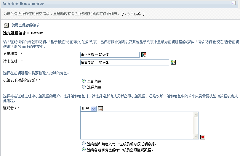 操作允许您启动证明流程以校验选定角色的指派的准确性。它还使您可以选择将与证明请求相关联的细节(如参数和表单值)保存为预填充表单以备将来请求之用。