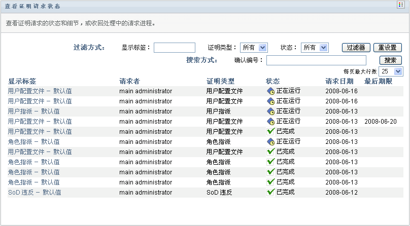 操作使您可以查看证明请求的状态。此外,还使您可以查看为某个请求启动的各个工作流程的状态并可选择收回一个或多个正在运行的流程。