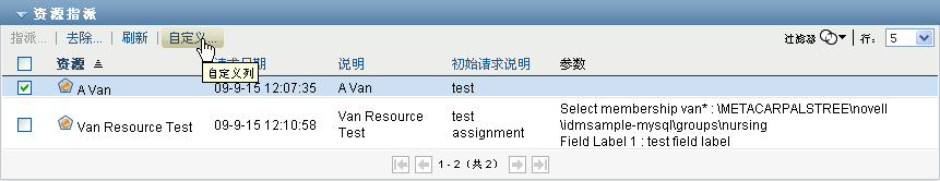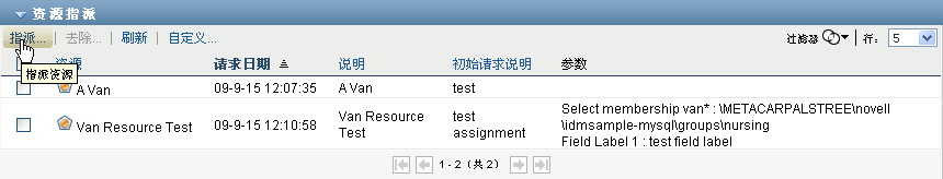 此时会显示资源的列表。如果您不处于受管模式,则所显示的资源指派是您作为收件人的那些资源指派。如果您处于受管模式,则所显示的资源指派是选定用户、组或容器作为收件人的资源指派。对于组和容器,所列出的资源是通过角色指派间接指派给选定组或容器的那些资源。组或容器的资源指派列表不包含直接指派给选定组或容器中的用户的资源。
