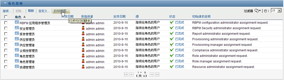 仪表板的部分允许您打印页面上显示的角色指派列表。屏幕上的内容与打印角色指派列表时的内容实际上是相同的,但打印输出仅包括屏幕上的文本。列或列中显示的任何图像都不会显示在打印输出中。