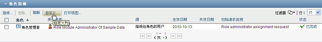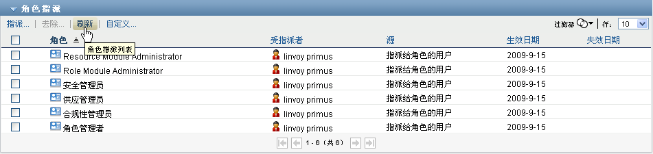 此时会显示角色的列表。如果您不处于受管模式,则所显示的角色指派是您作为收件人的那些角色指派。