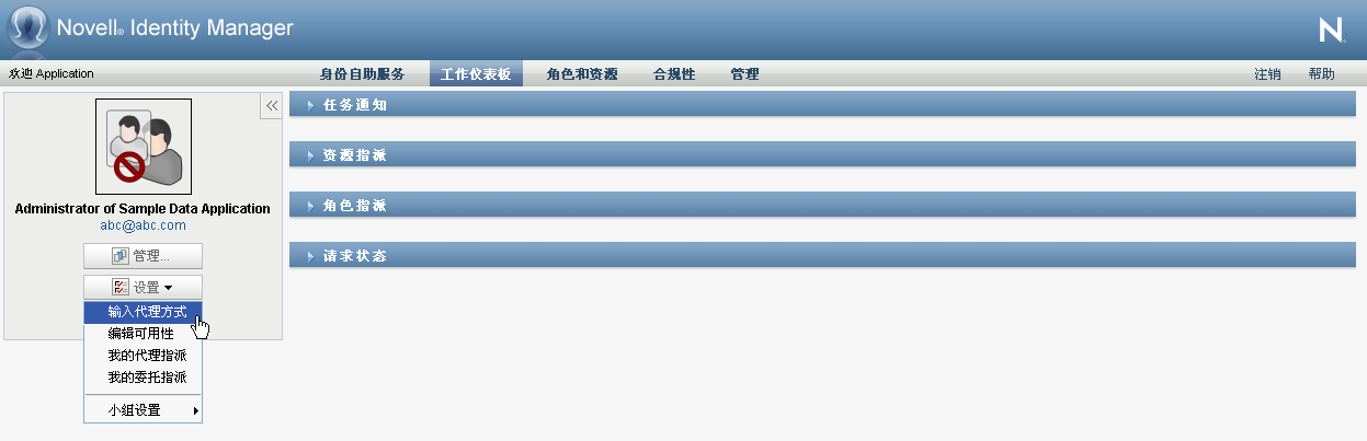 User Application 将刷新显示,并使您返回到操作,即登录后的默认操作。任务列表将显示指派给你作为代理的用户的任务。 组上方(以及标题栏中)将显示一条讯息,指明现在您正担当另一用户的代理。