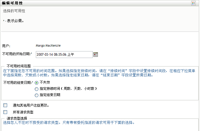 User Application 将显示一组控件,可使用这些控件指定您处于不可用状态的时间段,以及选择该设置适用于的请求。