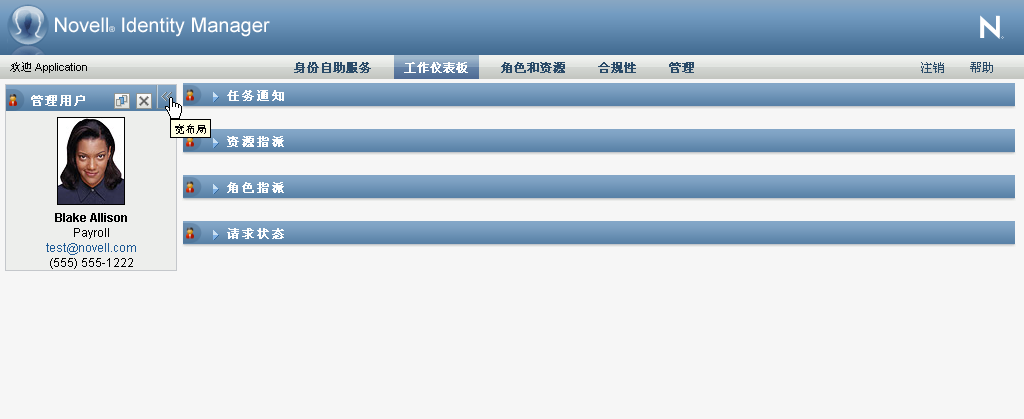 “用户配置文件”部分会隐藏关于当前选定实体的细节,为您留出更多空间来处理页面的“任务通知”、“资源指派”、“角色指派”和“请求状态”部分。