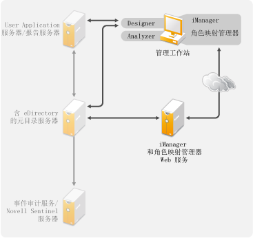 Identity Manager 解决方案的两个主要管理工具是 Designer 和 iManager,如图 3-2 中所示。Designer 在规划和创建 Identity Manager 解决方案期间使用,而 iManager 用于 Identity Manager 解决方案的日常管理任务。