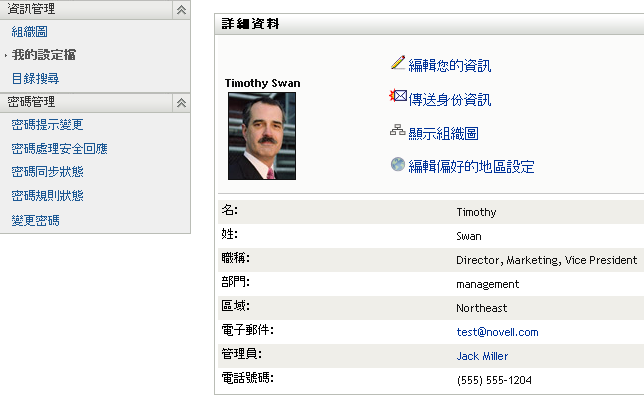 以下场景显示某个用户如何链接到另一用户和组细节。 Timothy Swan(市场营销部副总经理)登录 Identity Manager User Application,然后进入“我的配置文件”页面: