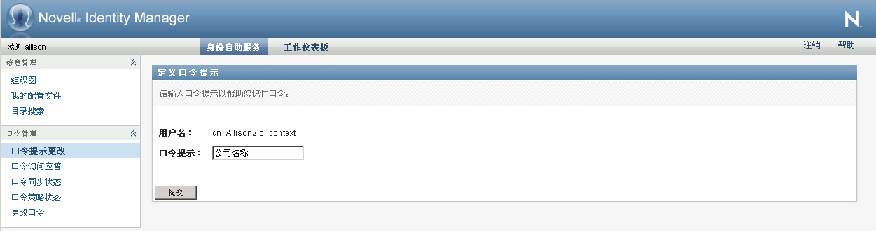 在身份自助服务选项卡上,单击菜单中的口令提示更改(在口令管理下方)。