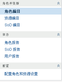 角色和资源选项卡的左侧显示可以执行的操作的菜单。这些操作按照类别(角色和资源、报告和配置)列出: