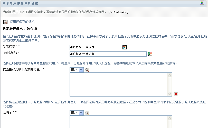 操作允许您启动证明流程以校验选定用户的角色指派的准确性。它还使您可以选择将与证明请求相关联的细节(如参数和表单值)保存为预填充表单以备将来请求之用。