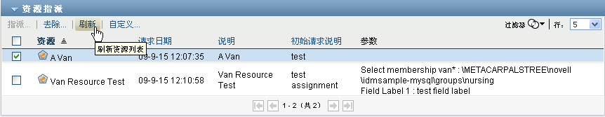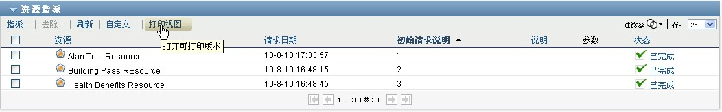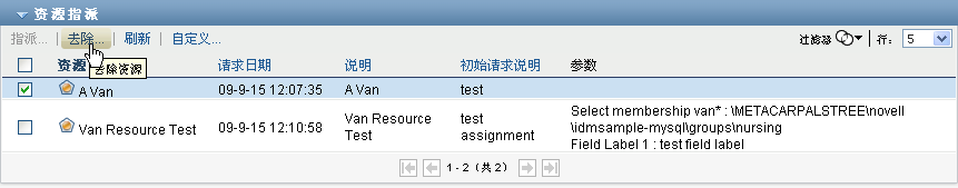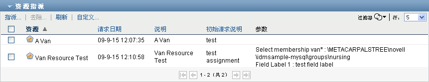 此时会显示资源的列表。如果您不处于受管模式,则所显示的资源指派是您作为收件人的那些资源指派。如果您处于受管模式,则所显示的资源指派是选定用户、组或容器作为收件人的资源指派。对于组和容器,所列出的资源是通过角色指派间接指派给选定组或容器的那些资源。组或容器的资源指派列表不包含直接指派给选定组或容器中的用户的资源。