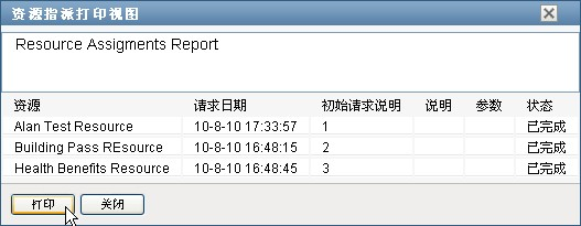 User Application 会在单独的窗口中显示资源指派列表的可打印版本: