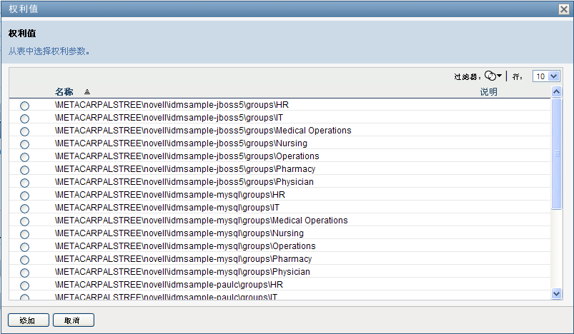 在小组管理者处于管理模式时,列表只包含与为选定小组配置指定的域相关联的资源指派。