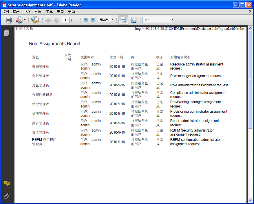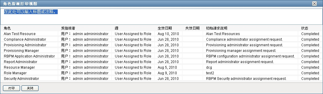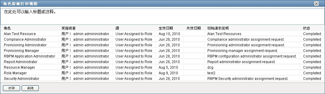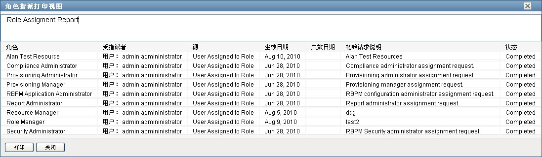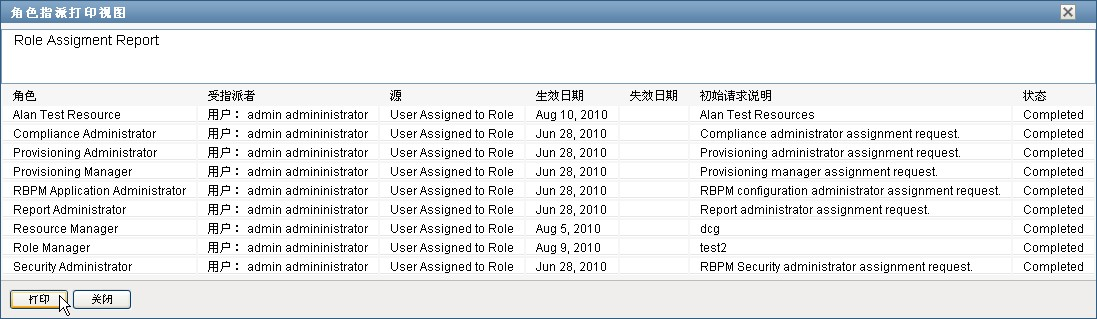 User Application 会在单独的窗口中显示角色指派列表的可打印版本: