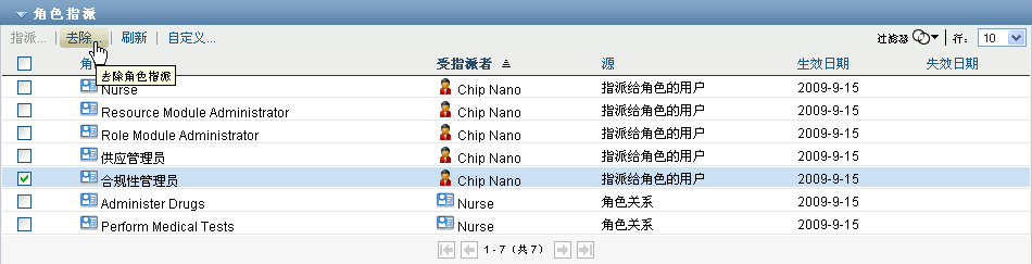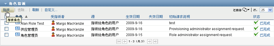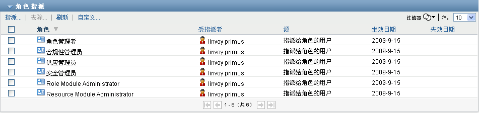 此时会显示角色的列表。如果您不处于受管模式,则所显示的角色指派是您作为收件人的那些角色指派。