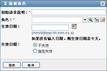 如果在控件中未作任何选择,则角色指派列表会显示当前用户的指派。这些角色指派包括:用户作为接收人或收件人的角色指派,以及接收人或收件人是当前用户所属的组、容器或角色的角色指派。用户可以对自己的角色指派执行任意操作,因为处理自己的角色无需任何权限。