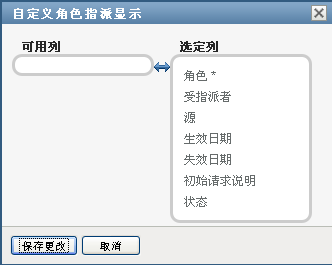 通过仪表板的部分,您可以选择和取消选择列,以及对任务列表显示内容中的列重新排序。列的选择和顺序由“自定义角色指派显示”对话框中的设置控制。在修改列的列表或对列重新排序时,您的自定义设置会与您的其他用户自选设置一起保存到身份库中。