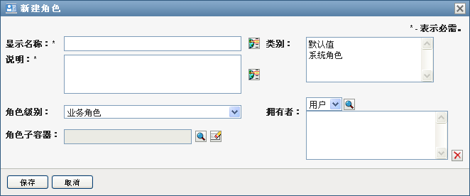 (修改角色时为只读。)从下拉列表中选择一个角色级别。 角色级别使用 Designer for Identity Manager 角色配置编辑器定义。 |
