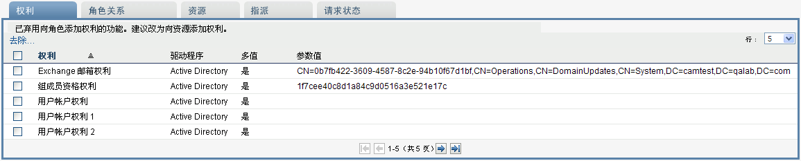 与现有角色关联的权利。 在早期版本的 Roles Based Provisioning Module 中定义的角色可能具有关联的权利。如果某个角色具有关联的权利,用户界面中会显示选项卡,通过该选项卡可以查看权利映射,并可选择去除它。在该版本中,可以继续使用角色的权利映射,但 Novell 现在建议您将权利与资源关联,而不是与角色关联。