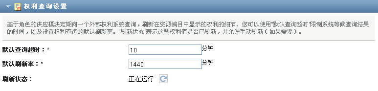 这些设置控制 User Application 执行的权利查询的行为。 您可以定义权利查询的超时间隔和刷新频率。此外,您还可以查看权利值是否已刷新,并开始手动刷新(如果需要)。