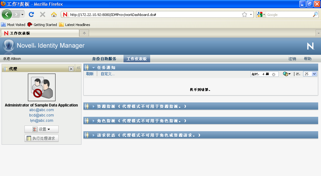 User Application 将刷新显示,并使您返回到操作,即登录后的默认操作。任务列表将显示指派给你作为代理的用户的任务。 组上方(以及标题栏中)将显示一条讯息,指明现在您正担当另一用户的代理。